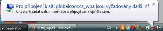 Nyní při připojování k síti globalcom.cz_wpa systém zobrazí bublinu na obrázku. Klikněte na ni a systém zobrazí formulář pro zadání přístupových údajů. |