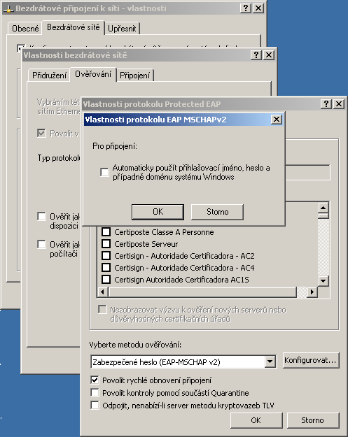 Zde odškrtněte volbu "Automaticky použít přihlašovací jméno,heslo a případně doménu systému Windows" Pokračujte OK,OK,OK a profil sítě globalcom.cz_wpa je vytvořen. |