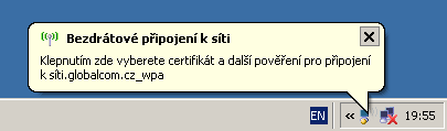 Dále vyhledejte v dostupných bezdrátových sítích síť globalcom.cz_wpa a stiskněte tlačítko připojit. Na spodní liště se objeví bublina níže. Dle návodu na ní klikněte. |