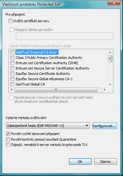 Odškrtněte volbu Ověřit certifikát serveru a pokračujte tlačítkem konfigurovat pro editaci metody ověřování EAP-MSCHAP2. |